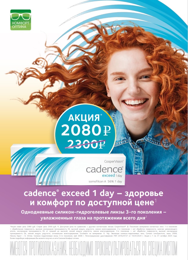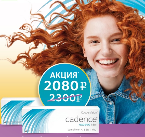Во всех салонах сети Комфорт Оптика действует акционное предложение по нашим флагманским МКЛ Контактные линзы Cadence® exceed 1 day по Новой цене – 2080 руб. вместо 2300 руб.